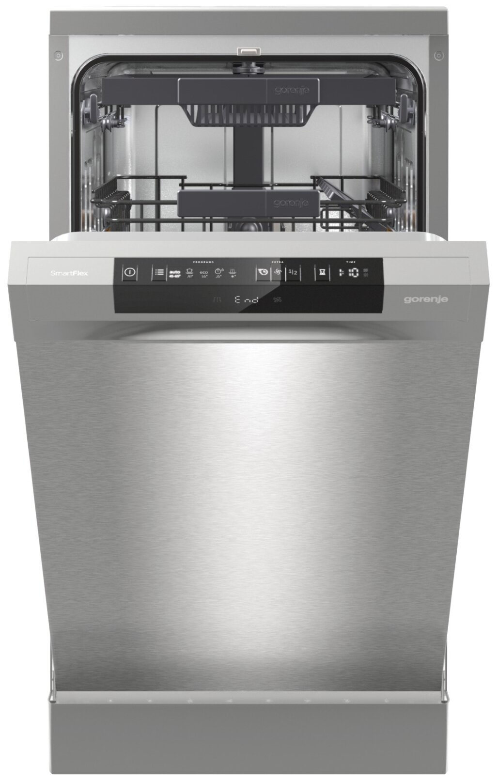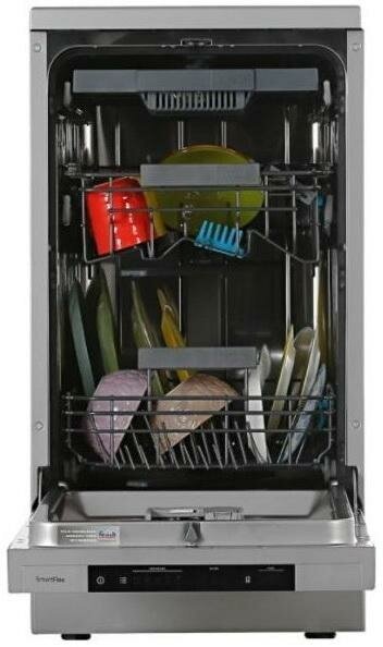 Отдельностоящая посудомоечная машина, Загрузка: 9, Количество программ: 5, Температурные режимы: 60, 55, 45, 35 °C, Количество корзин: 2, Количество уровней разбрызгивания воды: 4 уровня разбрызгивания воды, Полный AquaStop, Остаточным теплом, Управление: Кнопочная панель управления со светодиодной индикацией, Дисплей: ЖК-дисплей, Габаритные размеры (вхшхг): 84,5 × 44,8 × 60 см